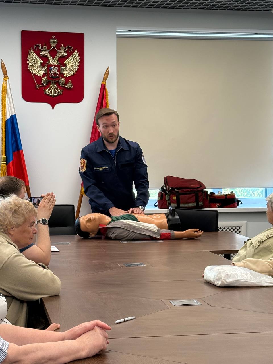На занятии сотрудник аварийно-спасательного отряда № 3 ГКУ ПСЦ г. Москвы продемонстрировал собравшимся приёмы оказания первой помощи пострадавшим до прибытия спасателей и бригады скорой помощи.