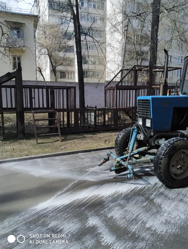 А на улице здание Управления обработали сотрудники ГБУ «Жилищник района Лианозово» – стены, окна, крыльцо и ручки на входных дверях, хозяйственные постройки на территории Управления, газоны и дорожки, деревья. Работники «Жилищника» для обработки использовали трактор в бак которого было залито средство, которое и вирус уничтожит и дорожки помоет.