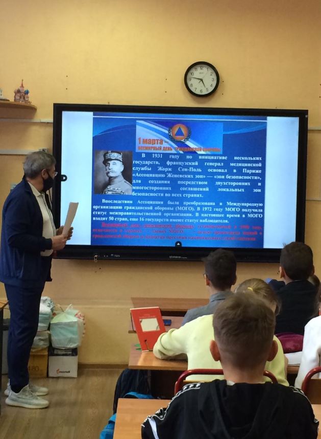 На уроках детям рассказали о международной организации гражданской обороны, о её создателе французском генерале медицинской службы, участнике I мировой войны, Жорже Сен-Поле. Какую идею он выдвигал, создавая эту организацию. Учащиеся узнали, что он хотел создать спокойные территории или зоны для населения, которые бы действовали на постоянной основе. Чтобы в военных конфликтах у гражданского населения был шанс выжить.