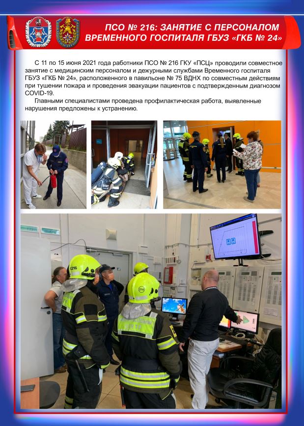 Работники Пожарно-Спасательного отряда № 216 ГКУ «ПСЦ», расположенного на территории самого крупного выставочного центра столицы – ВДНХ, провели совместное занятие с медицинским персоналом и дежурными службами Временного госпиталя ГБУЗ «ГКБ № 24», расположенного в павильоне № 75. На учениях отрабатывались совместные действия персонала госпиталя и пожарных и спасателей ПСО №216 ГКУ «ПСЦ» при тушении пожара и эвакуации пациентов с подтверждённым диагнозом COVID – 19.