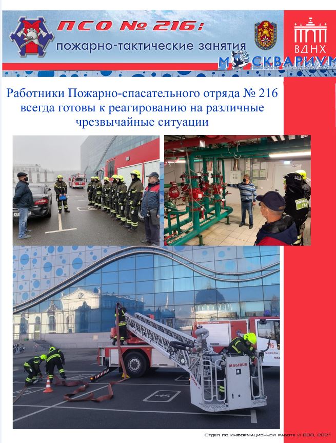 В первых числах ноября 2021 года работниками ПСО №216 были проведены пожарно-тактические занятия на здании центра океанографии и морской биологии «Москвариум», что находится на территории ВДНХ.
