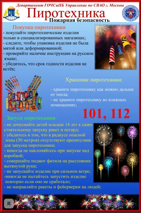 Сотрудники Управления Департамента ГОЧСиПБ по СВАО предупреждают о необходимости соблюдать правила пожарной безопасности и обращения с пиротехническими изделиями.